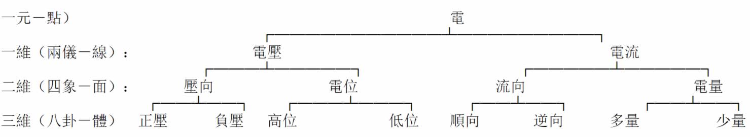 | 主題:覆試系統分類 朱夫子尊鑒: 依先生之教,從「務實」做起。從「基本電學」的「直流電學」的觀念,來做系統分類。 電,體:雲中陰陽交會,正電子、負電子相交所釋放的電能。 字首〔雨〕,體:陰陽之氣聚為雲,水從雲下。 字身〔申乙〕,用:象陰陽交會閃光之形。 流,用:水從高處順著山川向下移動,為必然的趨勢也。有「移動」之義。 字首〔水〕:體:液體。 字身〔 〕:體:川也。川為體,其用為流水。 直,用:十目所視者,不偏不曲也,應當。 用:連續而不變。 字首〔目 〕:用:視也 字身〔十〕:體:十之數也。 水流:水在川中由水位能高之處向水位能低之處的移動。 直流:流必有向,在單位時間內,移動的方向,固定不變。 電流:電子在電導體川中由電位能高之處向電位能低之處的移動。 直流電:在單位時間內,電子在電導體川中移動的方向,固定不變。 (一元–點): 直 流 電 ┌───────┴───────┐ 一維(兩儀–線): 極性 流向 ┌────┴────┐ ┌───┴────┐ 二維(四象–面): 陰極 陽極 反向 正向 ┌──┴──┐ ┌──┴──┐ ┌──┴──┐ ┌──┴──┐ 三維(八卦–體) 負電 符號(–)正電 符號(+) 放電 蓄電 蓄電 放電 蓄電為體,放電為用;放電為體,蓄電為用。 |
